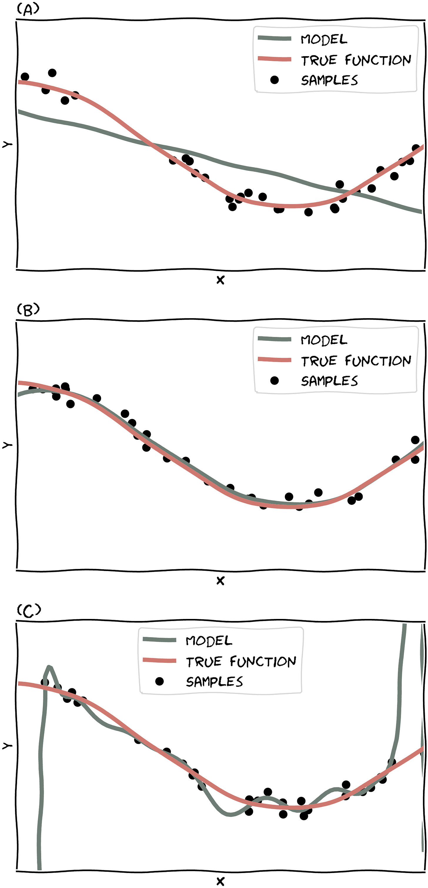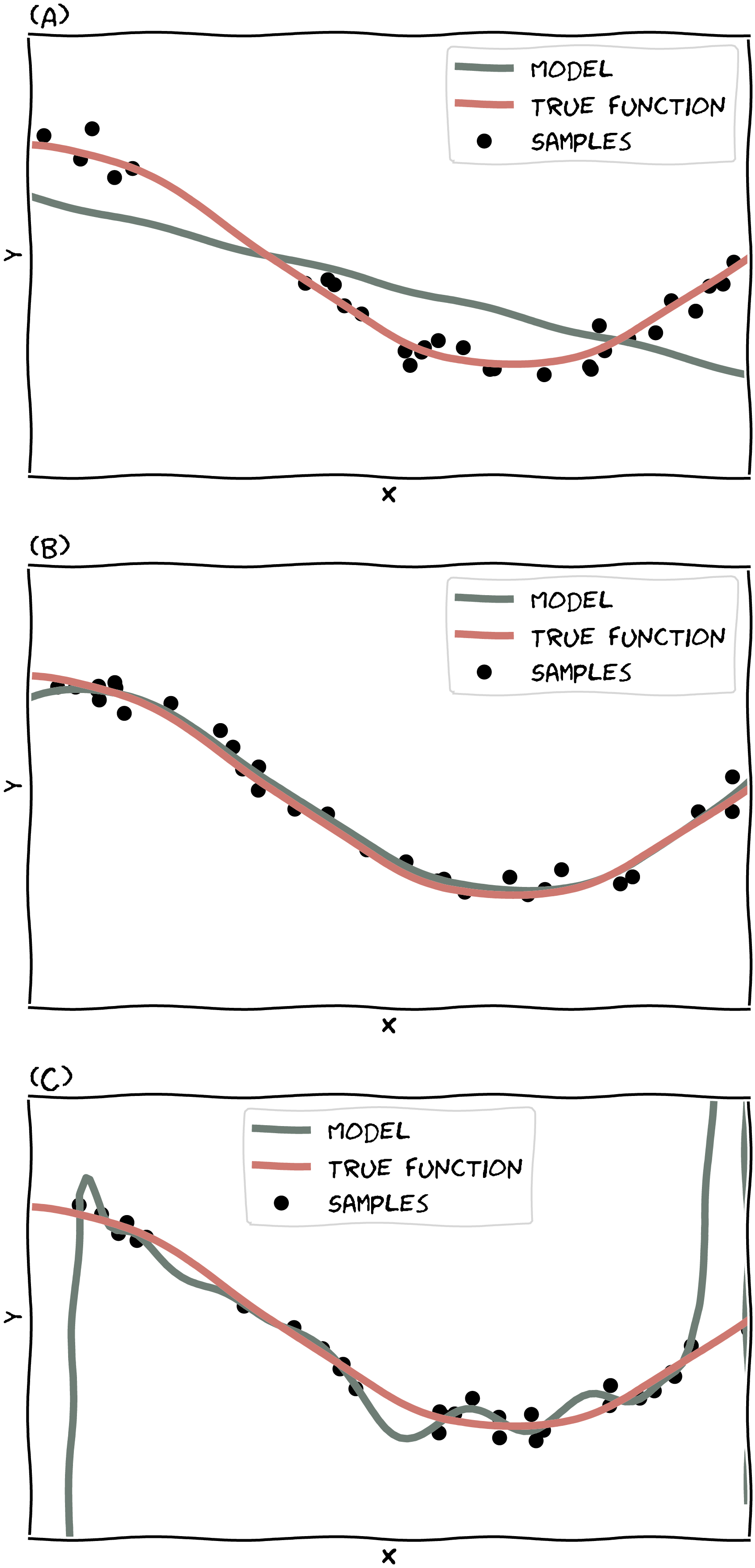Say the samples plotted are the training data, and the graph shows the true function and the function learned by the model. The linear function (our model) in (A) will likely underfits.