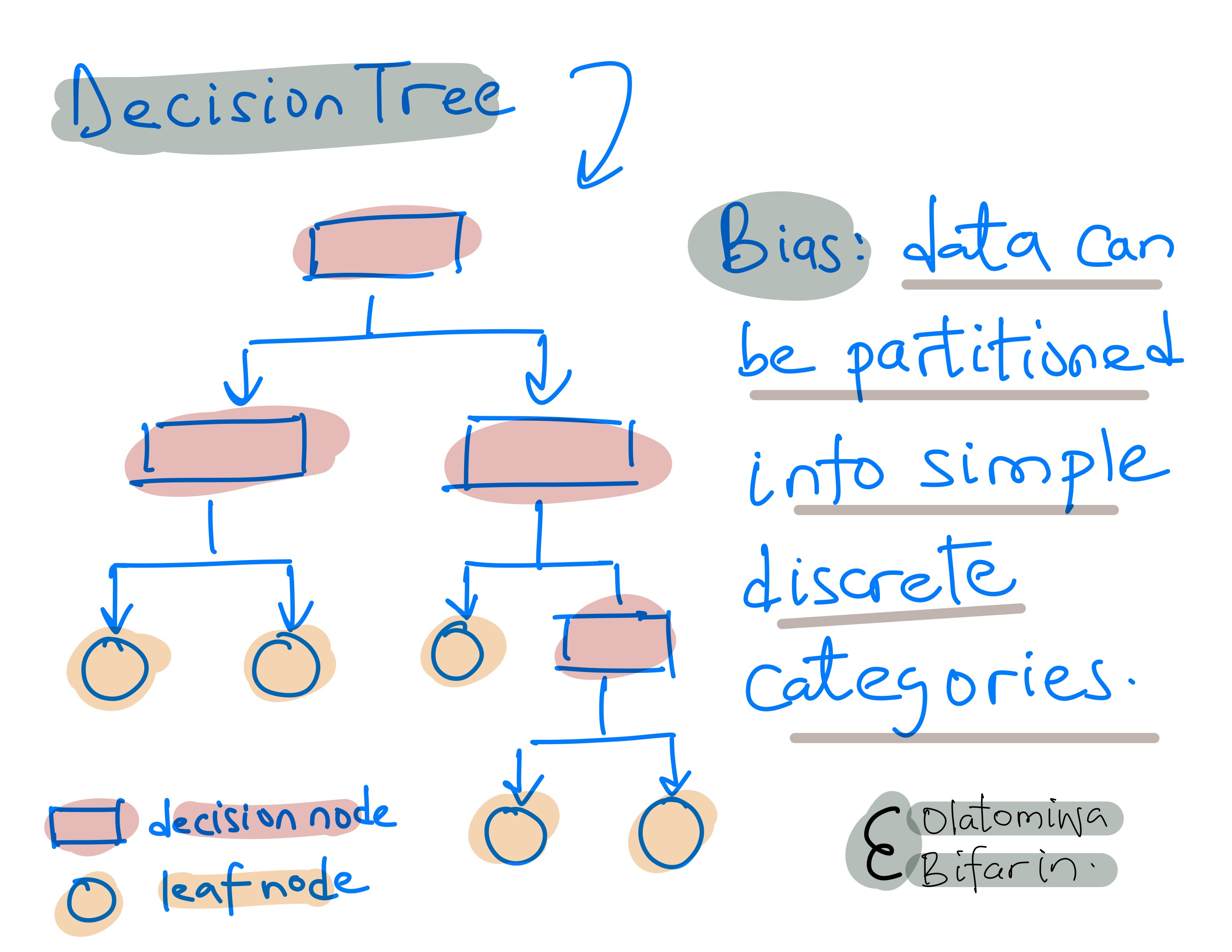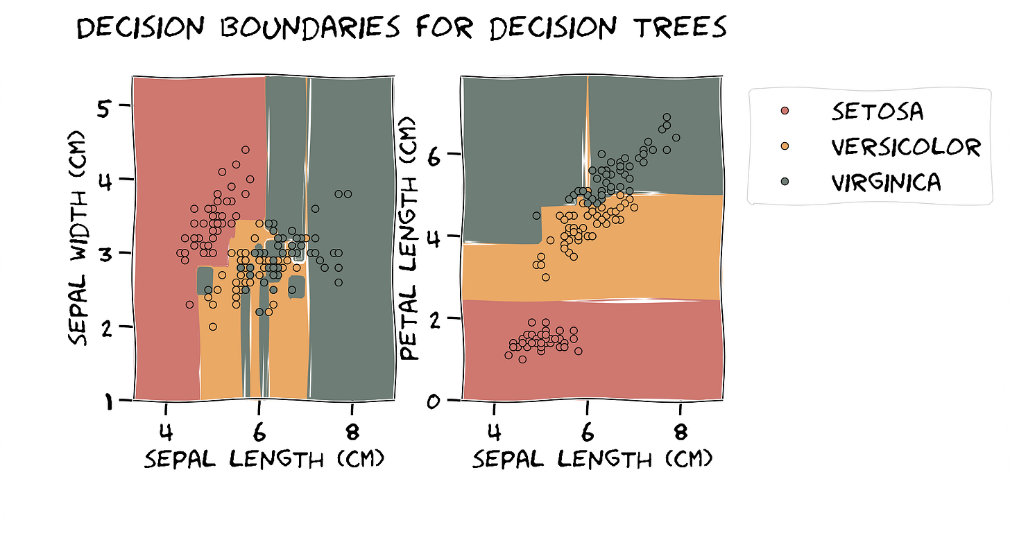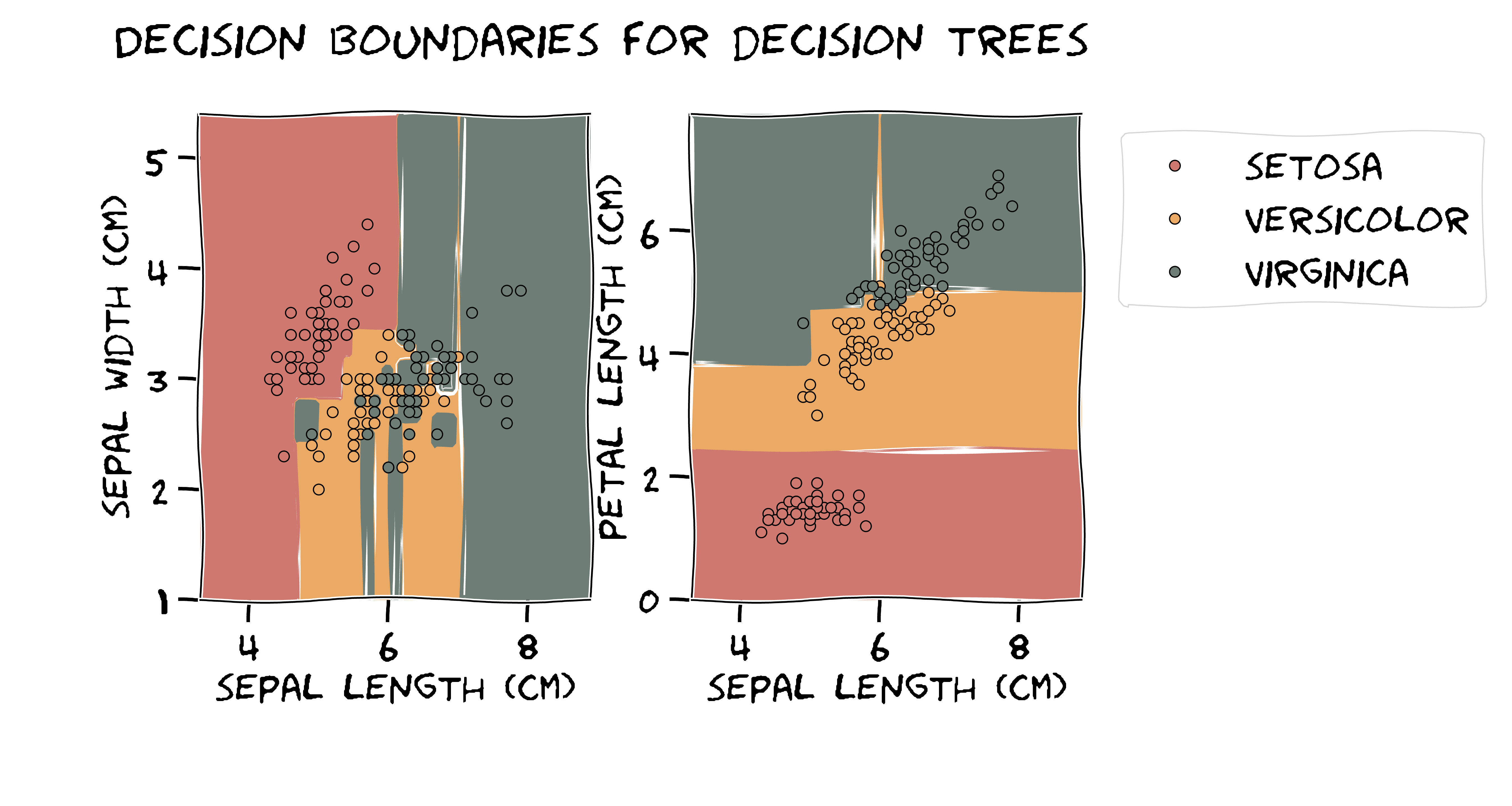 Working with the famous iris dataset, here is what the decision boundaries of a decision tree look like. Piecewise linear, axis-aligned, and hierarchical partitioning of the feature space. All these are because of the inductive bias it adopts.