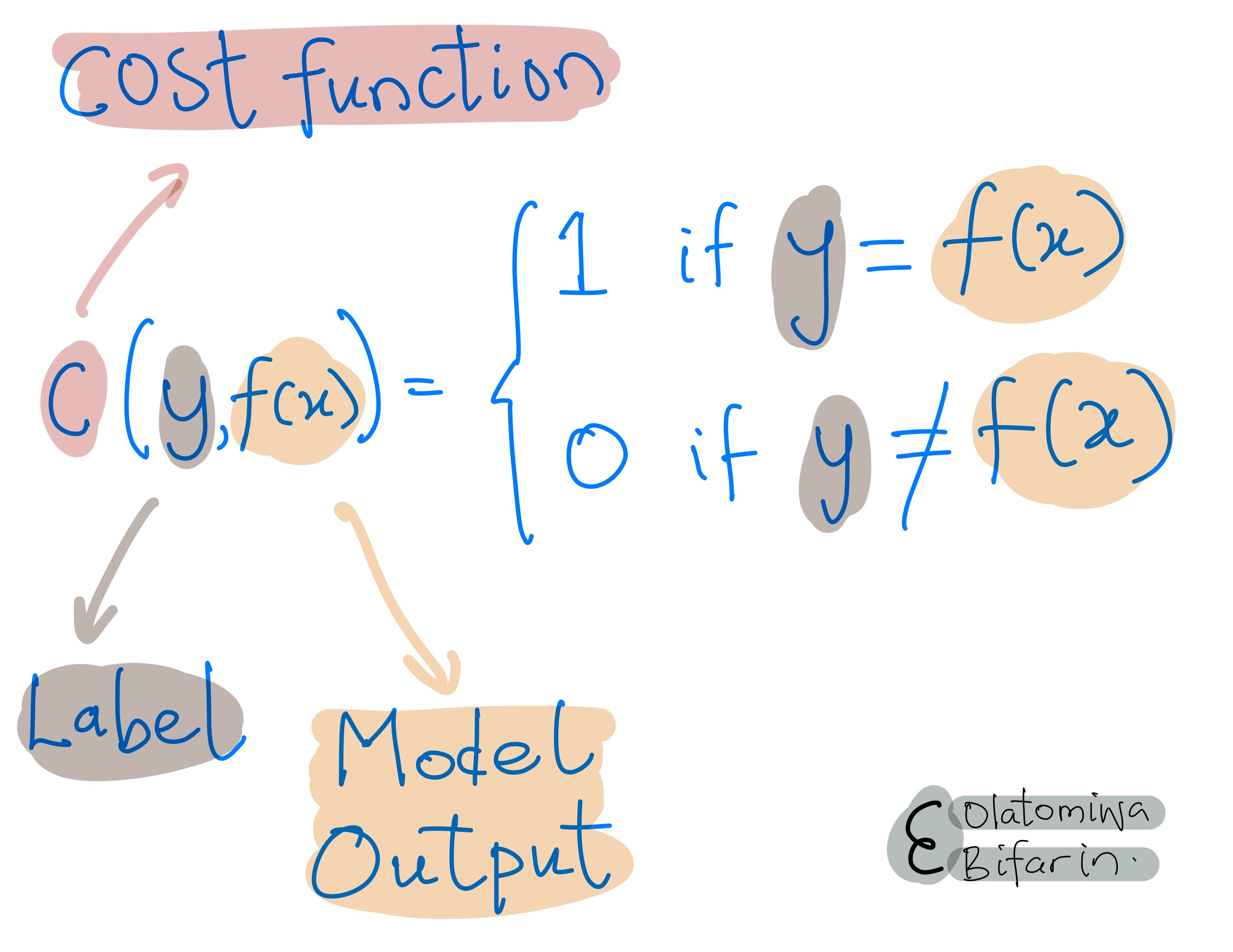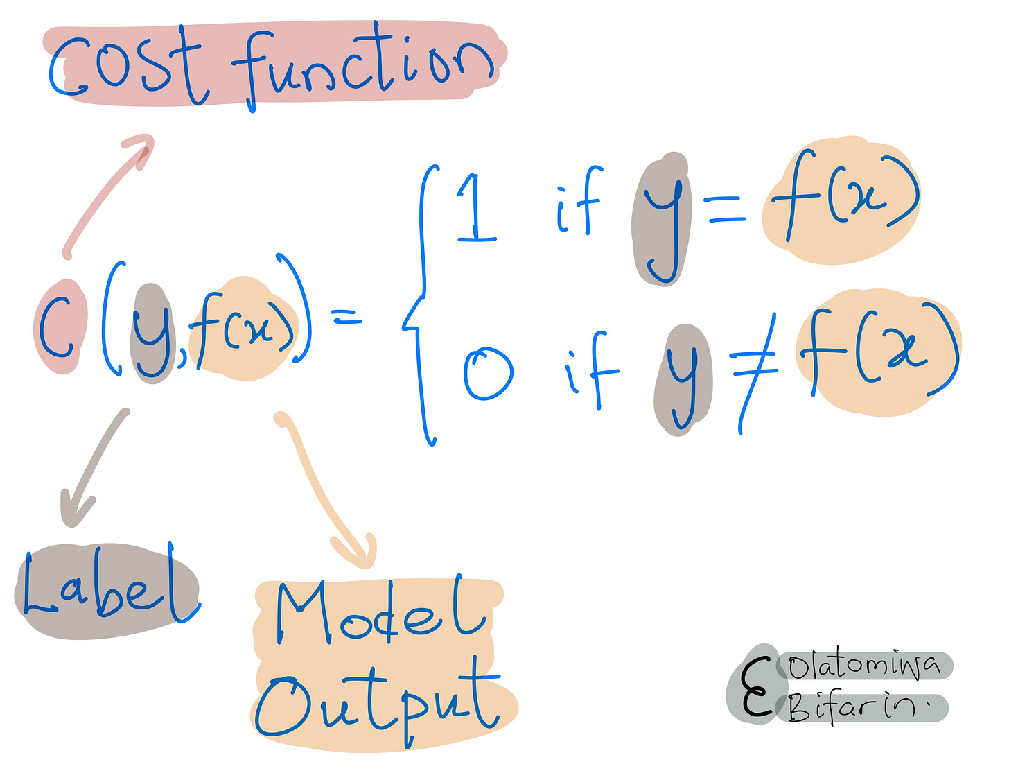 This expression defines a cost function that takes two arguments: label (ground truth) and model output. The function returns 1 if ground truth equals model output and returns 0 if ground truth does not equal model output. We can tabulate our results, and we have the model's accuracy.