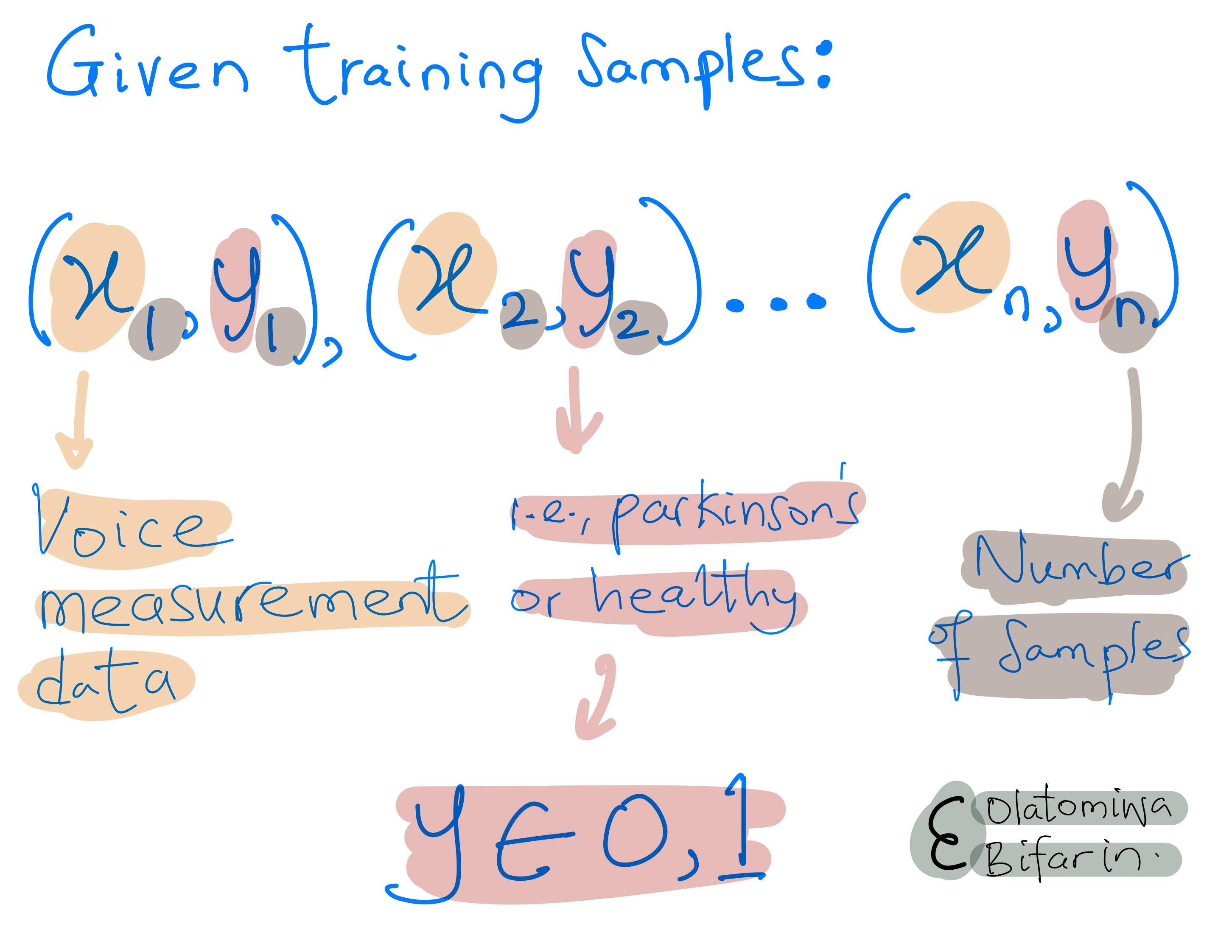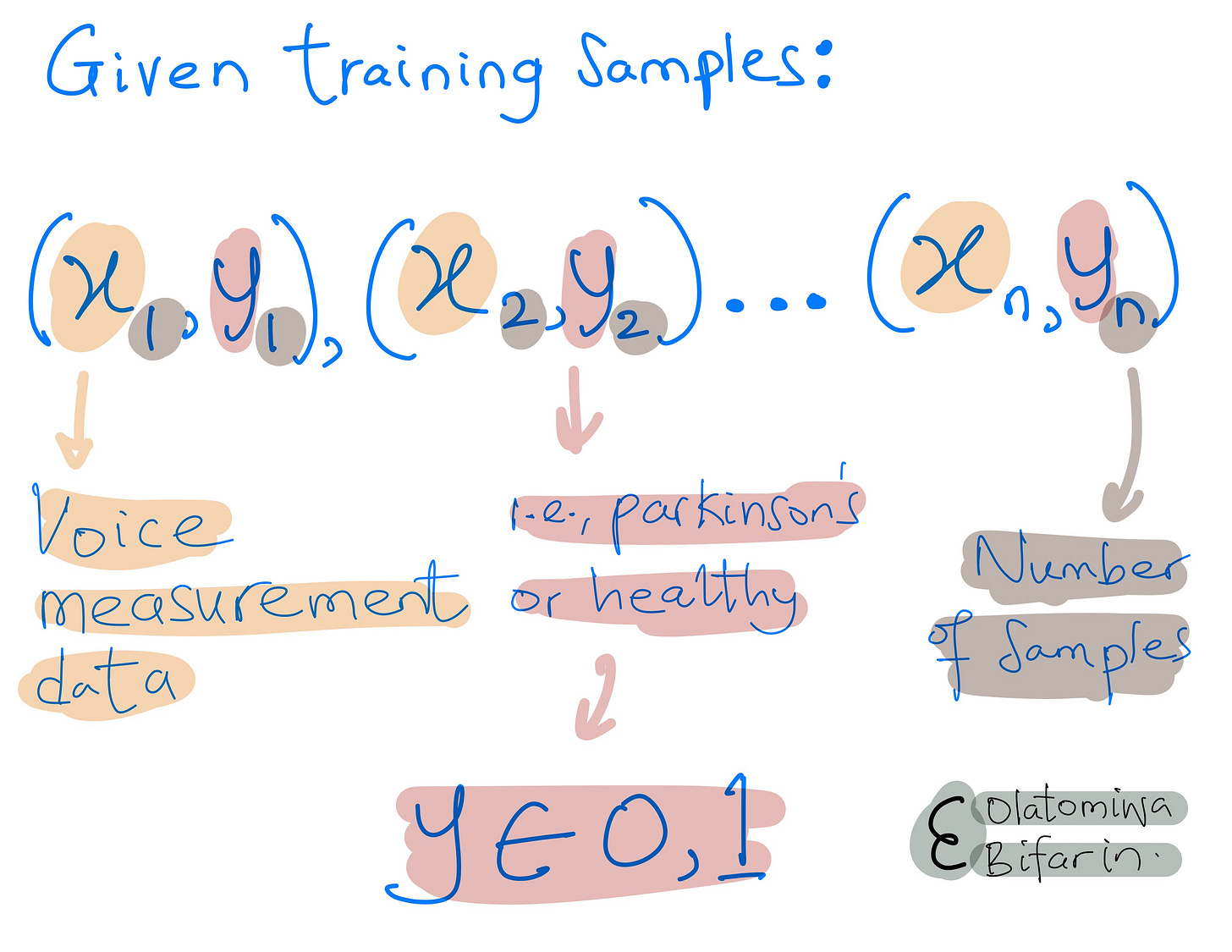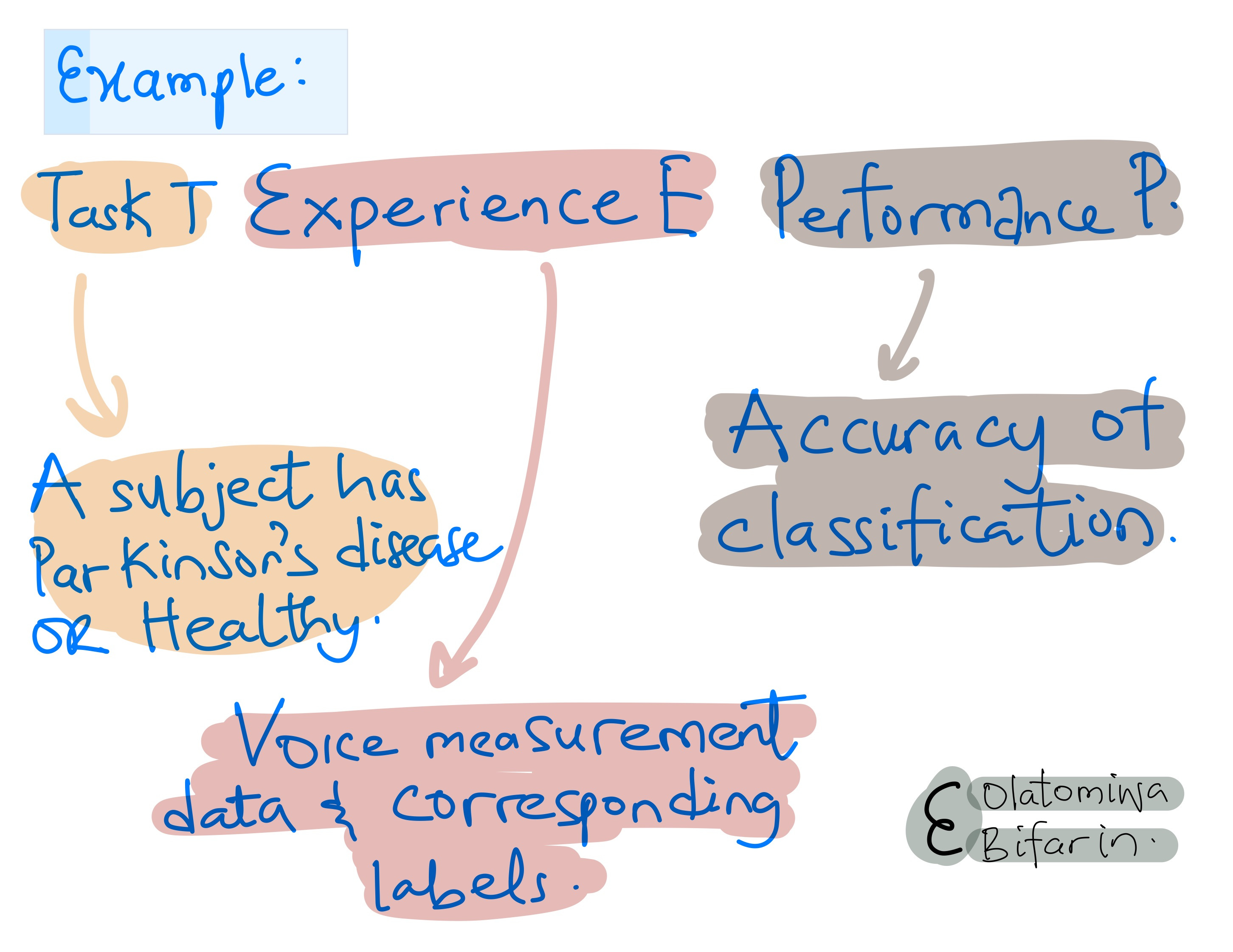 As you might have guessed, there are different types of task T, and the different kinds of task T would be handled differently. Take the Parkinson's disease example above, it is called a classification problem, expressed in its simplest form: binary classification. A or B. Disease or Healthy. Let's say a few things about this (and similar) problems before I proceed to some other machine learning problems.