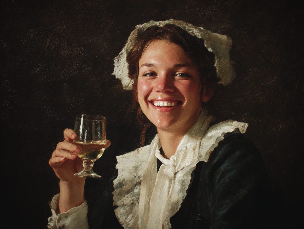 mid journey prompt v7: Painting in the style of Frans Hals, a happy, beautiful French maid woman holding and drinking a glass of white wine.