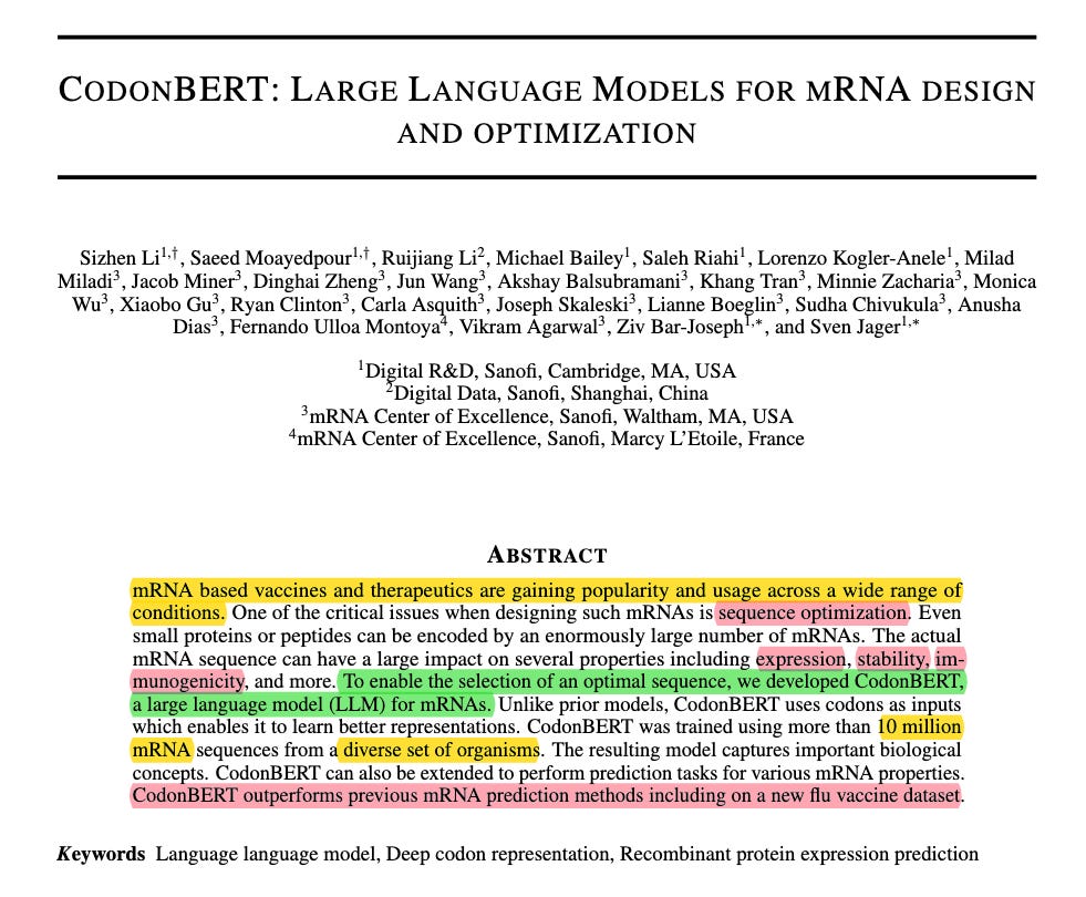 Summary: This study introduces CodonBERT, a LLM designed for mRNA sequence optimization, which demonstrates superior performance in predicting various mRNA properties and outperforms existing methods, including applications in flu vaccine development