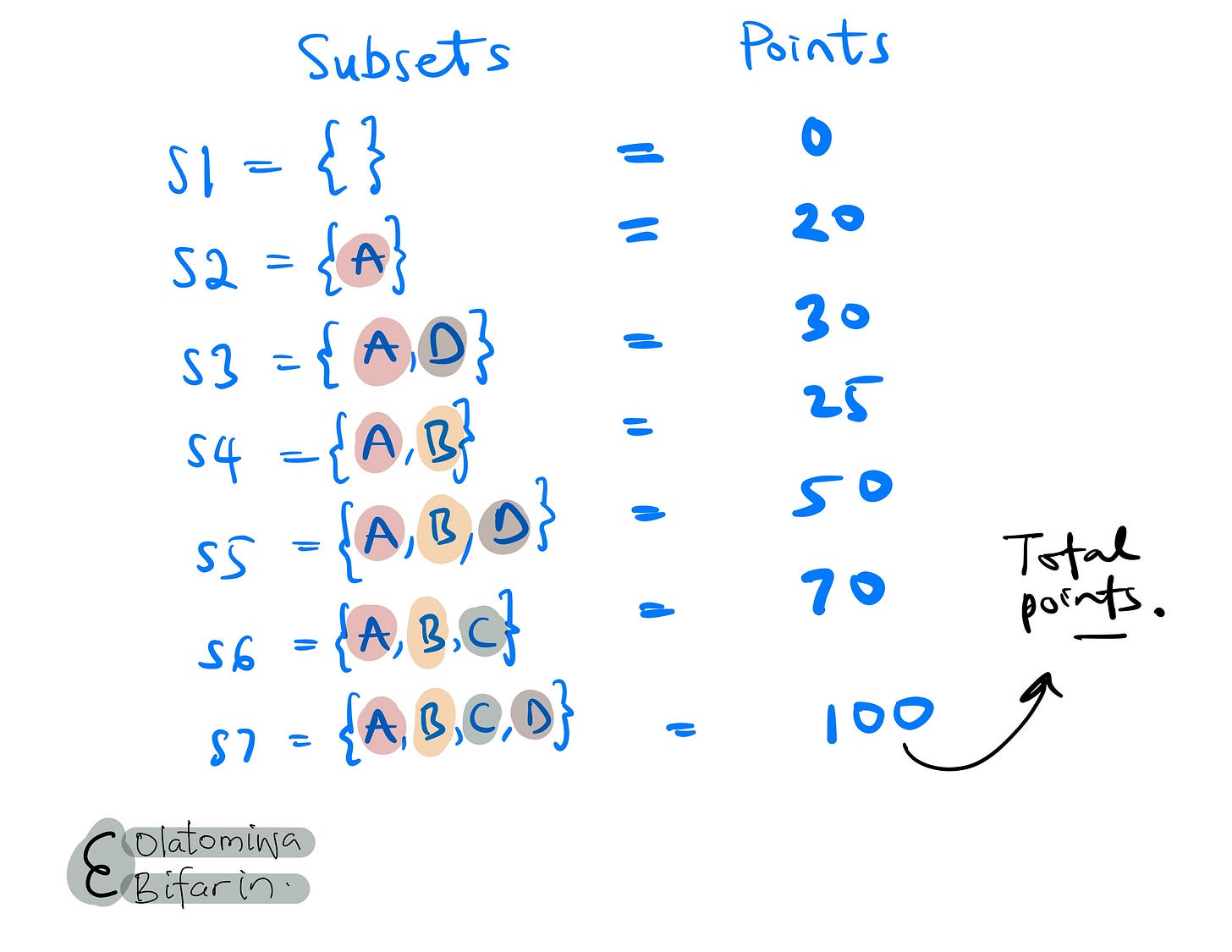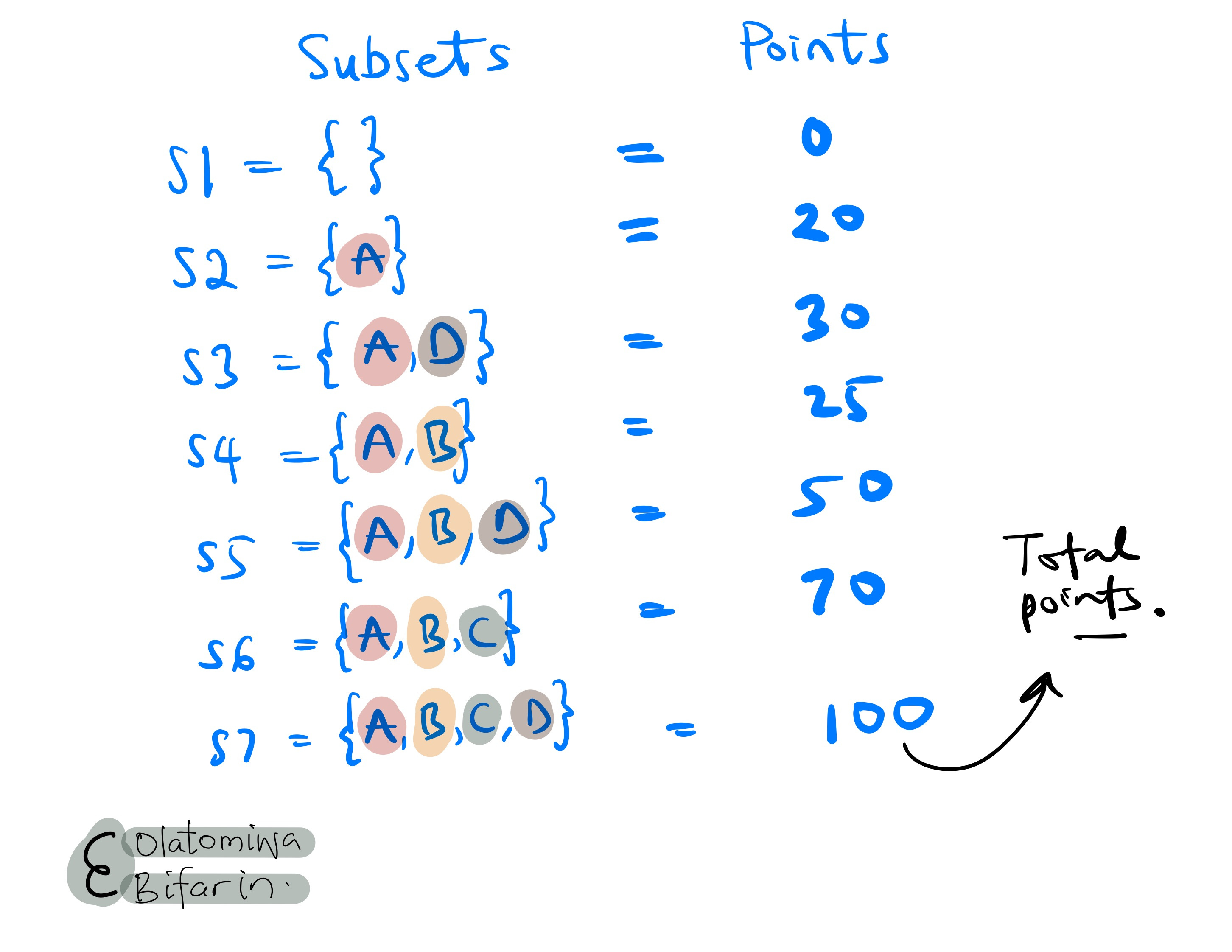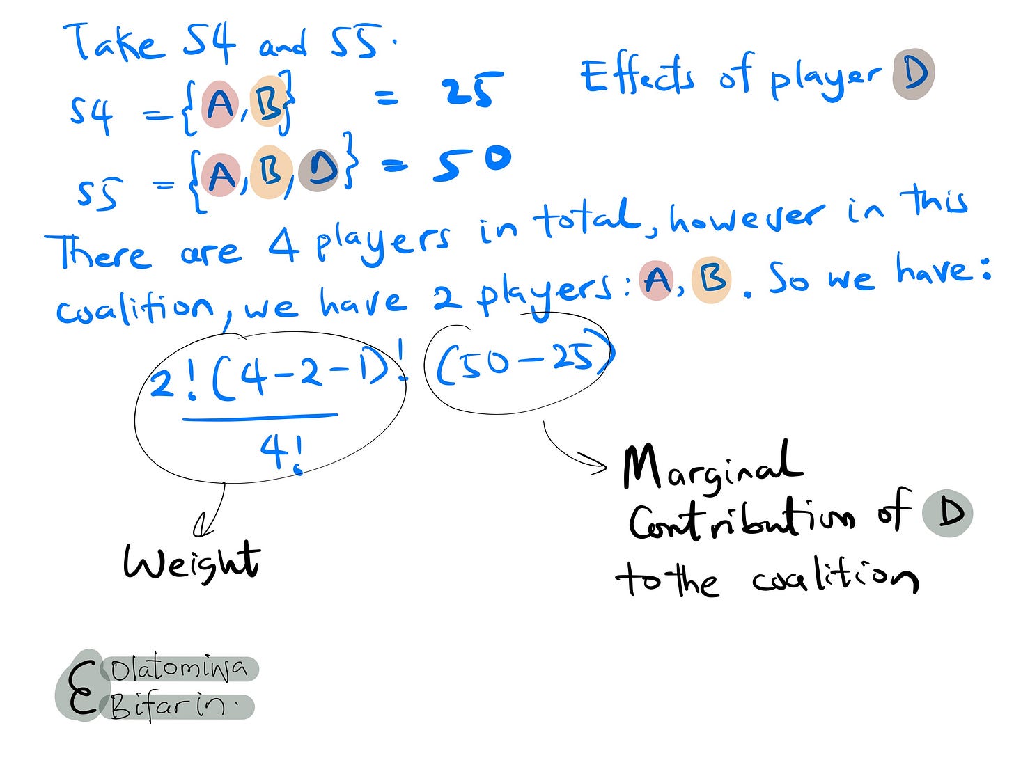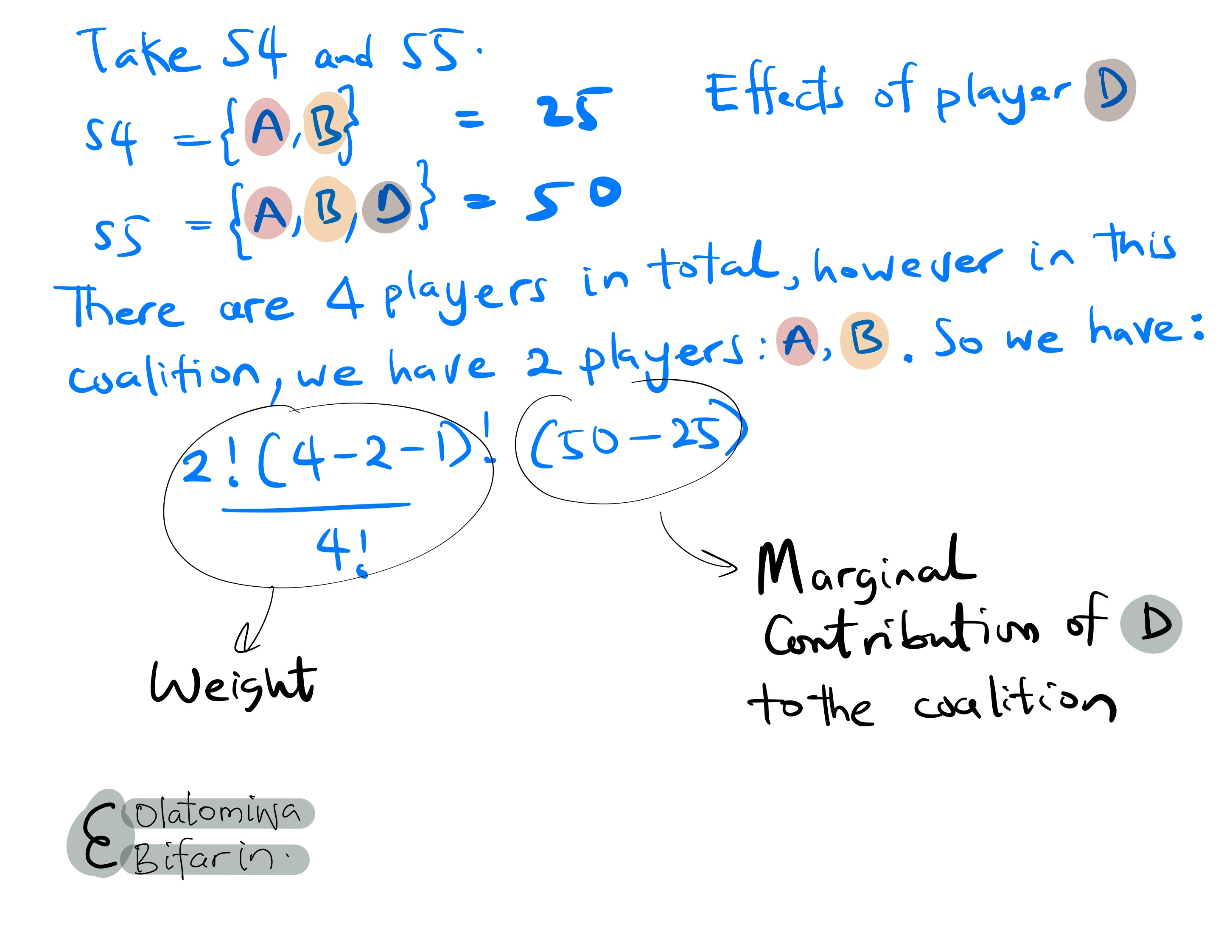 Homing in on player D: we will pick subsets that include and exclude player D in order to estimate the impact of the player. In essence, the marginal contribution of player D to each of those coalitions (I will continue to use coalition in place of subset).